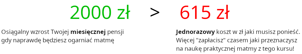 Jeśli jesteś juniorem zdobycie wiedzy z tego kursu bardzo pomoże Ci w awansie na specjalistę. Różnica w zarobkach między juniorem a specjalistą/mid’em sięga nawet do kilku tys. zł miesięcznie. Nawet jeśli całość kursu opłacasz samodzielnie, to jego cena będzie równa jedynie części kwoty o jaką wzrośnie Twoje miesięczne wynagrodzenie, gdy zostaniesz zatrudniony/a jako specjalista.